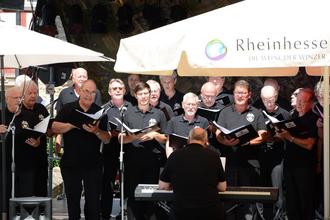 Der MGV in Aktion beim Fest zum 50-jährigen Jubiläum der Eingemeindung von Großwinternheim zu Ingelheim. Am Piano Chorleiter Udo Knab.