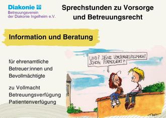 Das Sprechstundenangebot des Betreuungsvereins der Diakonie Ingelheim richtet sich an ehrenamtliche Betreuer:innen und Bevollmächtigte, die Fragen rund um das Betreuungsrecht oder zur Ausführung Ihrer Vollmacht haben, sowie an alle Interessierte, die sich über die verschiedenen Vorsorgemöglichkeiten wie Vorsorgevollmacht, Patientenverfügung oder Betreuungsverfügung informieren wollen.