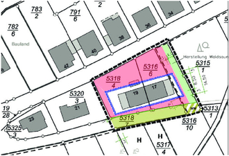 Mit der Einbeziehung einer kleineren Teilfläche aus dem Flurstück Nr. 5316/10 in der Größe von ca. 400 m² wird keine neue Baufläche geschaffen, sondern nur die bestehende Fläche des Flurstücks Nr. 5316/6 mit einem Schrägzuschnitt bereinigt. Die Bebauung des Grundstückes Hubertusstraße Nr. 17 überschreitet aktuell bereits geringfügig den Grenzabstand zum Nachbargrundstück Nr. 5316/10 und es besteht kein Bauwich-Abstand. Durch die von den Bauherren geplante Umnutzung von Garage zu Wohnraum ist der Bebauungsplan dahingehend anzupassen, da erst mit der Einbeziehung des geplanten Flächenanteils aus dem Flurstück Nr. 5316/10 das Gebäude Hubertusstraße 17 wirtschaftlich weiterentwickelt werden.