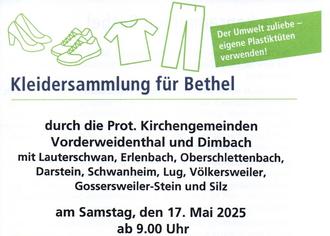 Am kommenden Samstag, 17. Mai führt die Kirchengemeinde Dimbach und Vorderweidenthal eine Kleidersammlung für Bethel durch. Gesammelt werden ausschließlich: Kleidung, Wäsche, Schuhe, Handtaschen,