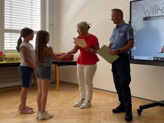 Bei einer kleinen Feierstunde in unserer Grundschule überreichte unsere Landrätin Frau Dr. Ganster mit den beiden Beamten der Verkehrspolizei Tanja Huber und Jürgen Büchler die Urkunden und Preisgelder.
