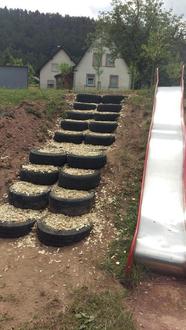 Am großen Spielplatz am Felsentor wurde einiges getan. Neben der Rutsche wurde eine neue Treppe gebaut. Dafür kommt ein ungewöhnliches Konzept zum Tragen - Autoreifen gefüllt mit Hackschnitzel. Die Kinder können sicher gehen und wenn tatsächlich mal ein Sturz passiert, sind Verletzungen unwahrscheinlich. Außerdem wurde der Fallschutz erneuert. Wir wünschen allen Kindern einen tollen Spielspaß.