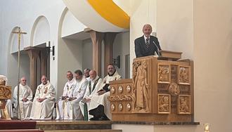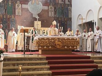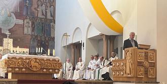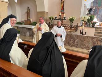 Am Sonntag, 09.07.23, wurde in der Christkönigskirche der Festgottesdienst zur Verabschiedung der Karmelschwestern gefeiert. Leider wird der Konvent aufgelöst, die Schwestern gehen in andere Klöster und für die Gebäude und das Gelände muss eine andere Nutzung gesucht werden. Der Gottesdienst wurde von Bischof Dr. Karl-Heinz Wiesemann geleitet. Mitgestaltet wurde er, neben zahlreichen geistlichen Herren, auch vom Generaldefinitor des Ordens, Pater Roberto Pirastu OCD aus Rom, dem Provinzial der Deutschen Provinz des Teresianischen Karmel, Pater Raoul Kiyangi, dem langjährige Hausgeistliche Pfarrer Robert Burger und vom Hauensteiner Pfarrer Ulrich Nothhof. Der Abschiedsgottesdienst wurde live im offenen Kanal übertragen. Die Schwestern wurden zu Beginn der Kirche in einer kleinen Prozession vom Pfarrheim zur Christkönigskirche begleitet. Nach dem Gottesdienst gab es auch von den weltlichen Vertretern Gruß- bzw. Abschiedsworte, die vom langjährigen Helfer - in allen Bereichen des Klosters und der Schwestern - Dieter Seibel eingeleitet wurden. Anschließend sprachen in folgender Reihenfolge, der Ortsbürgermeister Michael Zimmermann, die Landrätin Susanne Ganster und als Vertreter der kirchlichen Gremien Josef Reichert sowie Pfarrer Burger. Tenor aller Redner – großes Bedauern über den Weggang und „gute Wünsche, verbunden mit Gottes Segen“ für die Zukunft. Nach diesen Grußworten ergriff die Priorin des Klosters, Schwester Elia, das Wort und sprach aus ihrer Sicht zu den Anwesenden. Anschließend wurden von Pfarrer Robert Burger und Dieter Seibel, allen Schwestern als ewige Erinnerung an Hauenstein, ein kleiner Sandstein aus heimischem Fels, als dauerhaftes Andenken an Hauenstein, übergeben. Die musikalische Gestaltung übernahmen der Musikverein, der Kirchenchor und der Singkreis Schola. Nach dem Auszug gab es noch einen Empfang im Pfarrheim, den die Pfarrei als Dank zur Verabschiedung der Schwestern vorbereitet hatte.