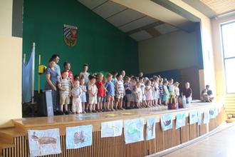 Am Freitag, den 4. Juli fand unsere Feier zum 10-Jährigen Kindergartenjubiläum statt. Knapp 300 Gäste feierten mit uns dieses große Ereignis. Nach einer kurzen Begrüßungsrunde durch die Leitung Jennifer Eitzenberger, Ortsbürgermeister Georg Eitel und Verbandsbürgermeister Patrick Weißler waren die Kinder dran, die Gäste zu begrüßen. Zuerst gab wurden 2 Lieder gesungen, danach wurden alle Gäste aufgefordert bei einem Tanz mitzumachen, was auch sehr gut funktionierte. Die Vorschulkinder spielten ihr Theaterstück „vom Löwen der nicht schreiben konnte“ vor und sangen noch das altbewährte Schullied „Alle Kinder lernen lesen“.