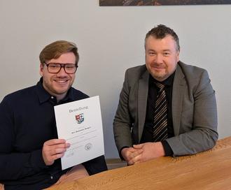Der neue Behindertenbeauftragte Maximilian Mengert (links) mit Bürgermeister Patrick Weißler