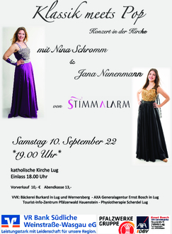 Am Kerwesamstag, 10. September ab 19:00 Uhr gastieren die Sängerinnen Nina Schromm und Jana Nunenmann von der aus Rundfunk und SWR-Fernsehen bekannten Formation „Stimmalarm“ in der Luger Kirche. Sie sind weit über Süddeutschland hinaus bekannt und geben auch als Solistinnen in ganz Deutschland Konzerte.