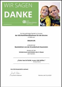 Unsere Kinder der Klasse 4b aus der Grundschule Hauenstein, präsentieren stolz ihre gesammelten Spenden. Mit viel Herzblut und Fleiß haben sie es geschafft, ganze 500 € für die Kinder der Ukraine zu sammeln. Sie haben kleine private Flohmärkte organisiert, Gebasteltes verkauft und fleißig gesammelt.