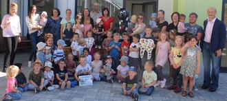 KiTa-Team mit Kindern und Leiterin Kerstin Braun, Vorsitzender AGZ Dr. Jürgen Simonis, Ortsbürgermeister Michael Zimmermann und Maskottchen Max Schrubbel.