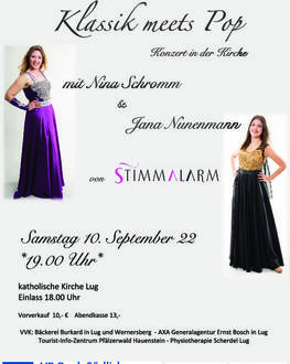 Am Kerwesamstag, 10. September ab 19:00 Uhr gastieren die Sängerinnen Nina Schromm und Jana Nunenmann von der aus Rundfunk und SWR-Fernsehen bekannten Formation „Stimmalarm“ in der Luger Kirche. Sie sind weit über Süddeutschland hinaus bekannt und geben auch als Solistinnen in ganz Deutschland Konzerte.