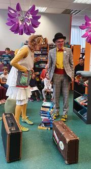 Der Besuch von den Clowns, die von den Kindern alles über Bücher und Regeln der Bücherei gelernt haben, war eine große Überraschung. Am Ende waren die beiden so buchbegeistert, dass sie ihre Koffer mit Bücher vollgepackt haben. Die lustigen Clowns haben sogar die Verleihung der Urkunden für die Kinder und die Verlosung der Preise übernommen, um sich die Bücher zu verdienen.