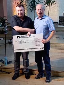Zu Beginn des Konzertes sprach Bürgermeister Patrick Weißler Grußworte zum 50-jährigen Bestehen der Verbandsgemeinde und übergab Ortsbürgermeister Hermann Rippberger einen Scheck