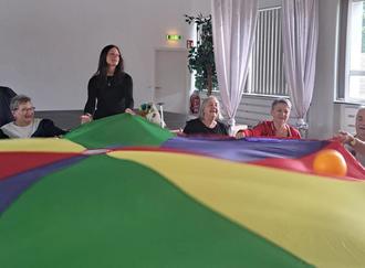 Mit viel Spaß und Lachen ging es nach der Pause mit dem Schwungtuch und vielen Luftballons weiter. Frau Becker Inge ergänzte konzentriert und kompetent das Programm sowohl mit Übungen für die Augen und gegen den Schwindel, als auch mit Fingerübungen für die Synapsen im Kopf.