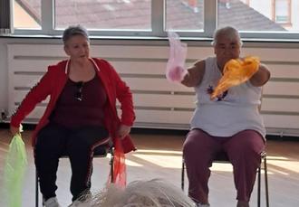 Nach kurzer Begrüßung durch die Seniorenbeauftragte Frau Falkenhain, übernahmen die beiden Gemeindeschwestern, Frau Kolb und Frau Jung die Regie. Auf eine Aufwärmungsrunde folgten mit „Tulpen aus Amsterdam“ und „Himbeereis zum Frühstück“ beschwingte Sitztänze mit bunten Tüchern. Bei einem imaginären Rundgang durch die Altwiesen, unterstützt von Frau Schmitt Kirstin folgte eine Gymnastikrunde mit verschiedenen Schwerpunkten von Kopf bis Fuß, jeder in seinem Tempo, im Stehen oder im Sitzen und immer im Bereich seiner Möglichkeiten.