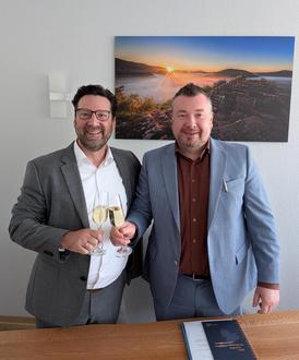 Bürgermeister Holger Zwick (links, VG Dahner Felsenland) und Bürgermeister Patrick Weißler (rechts, VG Hauenstein) legen den Grundstein für ein Kommunales Medizinisches Versorgungszentrum