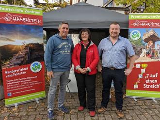 Bürgermeister Patrick Weißler und Andreas Wilde, der Beigeordneten der Verbandsgemeinde Hauenstein sowie der Ortsgemeinde Hauenstein wurden am Stand von Frau Sonja Spieß, Leiterin des Tourist-Info-Zentrums, begrüßt.
