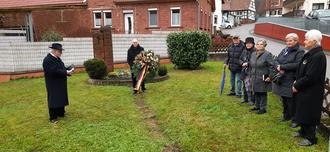 Im Beisein von Pfarrer Berthold und einigen Teilnehmern des Gottesdienstes sowie Ortsbürgermeister Ladenberger legte Edmund Keller auch im letzten Jahr im Namen der Ortsgemeinde und des VDK einen Kranz nieder.