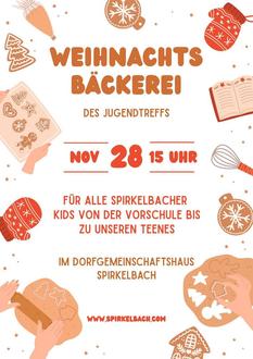 Deshalb findet der Jugendtreff am Freitag im DGH statt und es wird jede Menge Weihnachtsgebäck zubereitet. Wir freuen uns auf alle Spirkelbacher Kids und Teens. Start: 15:00 Uhr