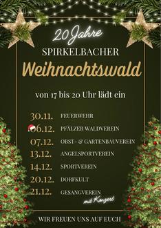 Seit nunmehr 20 Jahren dürfen wir in Spirkelbach eine ganz besondere Tradition erleben: unseren Weihnachtswald. Was einst eine Inspiration unseres damaligen Bürgermeisters Gerhard Christmann war, während eines Urlaubs im Harz entdeckt, wurde dank seines Pioniergeistes und der Unterstützung des damaligen Gemeinderates bereits im folgenden Jahr bei uns Wirklichkeit.