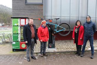 Bürgermeister Patrick Weißler, Sonja Spieß, Leiterin der Tourist-Info und Stephan Marx, Geschäftsführer des Moutainbikeparks Pfälzerwald e.V. präsentieren mit Streckenpfleger Reinhold Wieser das neue Serviceangebot für den Radtourismus. Am Standort des Tourist-Info-Zentrums Pfälzerwald der Urlaubsregion Hauenstein hat man eine ideale Stelle für die Radreparatursäule gefunden, diese wurde direkt neben der E-Bikes Ladestation installiert.