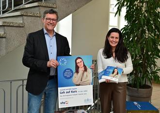 Regionalverbandsdirektor Peter Gillo und vhs-Direktorin Dr. Carolin Lehberger präsentieren das neue Programm der vhs. Nicolas, der im Porträt-Zeichenkurs eigene Bilder entstehen lässt, ist das Semestergesicht.