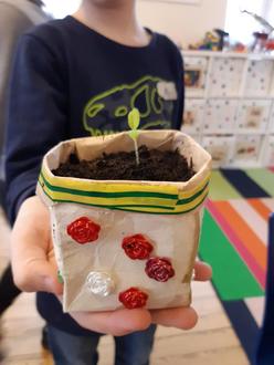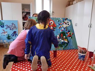 Danach starteten verschiedene Workshops und es gab auch die Möglichkeit zum freien Spielen im Haus. Passend zum Thema gab es ein Upcycling von Tetrapacks zu Blumentöpfen, die dann angemalt und mit Tomatensetzlingen bepflanzt wurden. Auf kleinen bespannten Keilrahmen wurden aus Ästen und Knöpfen fantasievolle Kunstwerke gestaltet. Um die Sachen auch alle sicher nach Hause bringen zu können gab es ein Angebot, in dem Taschen bemalt wurden. Wer es lebendiger haben wollte fand immer Fußballbegeisterte für den Kicker unterm Dach.