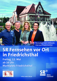 Am Freitag, 12. Mai, sendet das SR Fernsehen fast zwei Stunden lang live vom Marktplatz in Friedrichsthal: Um 18.15 Uhr begrüßen Verena Sierra und Michael Friemel zur Showsendung „SR Fernsehen vor Ort – Wir in Friedrichsthal“, und ab 19.20 Uhr präsentieren Sonja Marx und Joachim Weyand den „aktuellen bericht“ direkt vom Marktplatz.