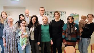 Der Erste Regionalverbandsbeigeordnete Jörg Schwindling (hintere Reihe, rechts) besuchte gemeinsam mit vhs-Direktorin Dr. Carolin Lehberger (vordere Reihe, 5. v. r.) sowie Stefan Gebhardt (hintere Reihe, links) und weiteren Vertreterinnen der Diakonie Saar den „Mama lernt Deutsch Kurs“ in Saarbrücken Malstatt