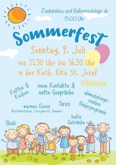 Die Kita St. Josef in Bildstock (Schachtstraße 11) lädt alle Interessierten herzlich zu unserem Sommerfest ein. Das Fest findet am Sonntag, dem 09.07.23 rund um die Kita in der Zeit von 11:30 bis 16:30 Uhr statt. Für das leibliche Wohl wird bestens gesorgt. Außerdem gibt es ein buntes Mitmachprogramm für Kinder, eine Olympiade, Glitzertatoos und Kinderschminke, eine Tombola und um 15 Uhr einen Zauberer. Wir freuen uns über alle Besucher.