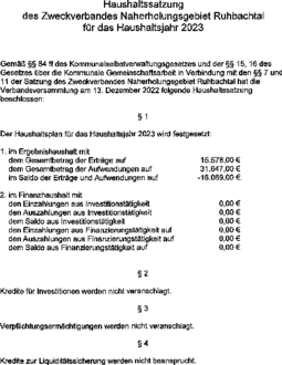Nachstehend wird die Haushaltssatzung des Zweckverbandes Naherholungsgebiet Ruhbachtal für das Haushaltsjahr 2023 öffentlich bekanntgemacht.