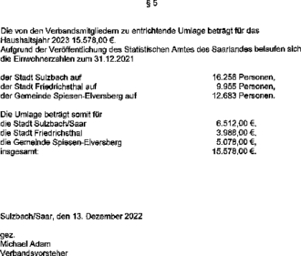 Gemäß § 86 Abs. 4 KSVG ist der Haushaltsplan im Rathaus, Zimmer 100, Sulzbachtalstraße 81, 66280 Sulzbach/Saar, ab dem Tag der Veröffentlichung an sieben Werktagen in der Zeit von 8.30 Uhr bis 12.00 Uhr und von 14.00 Uhr bis 15.30 Uhr öffentlich ausgelegt.