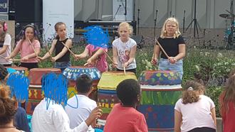 Ein Schuljahr lang übten die Drittklässler das Trommeln auf den Fässern. In Zusammenarbeit mit der Musikschule Sulzbach-Fischbachtal leitete Herr Scheid das Klassenprojekt „Trashdrumming“ an der Hoferkopfschule.