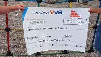 Kurz vor den Sommerferien konnten sich die Schüler*innen und die Lehrerinnen der Hoferkopfschule über eine beachtliche Spende freuen. Herr Strobel, Inhaber der Firma CaStro Bau, überbrachte Schulleiterin Frau Silke Knorst einen Scheck über 500 Euro.