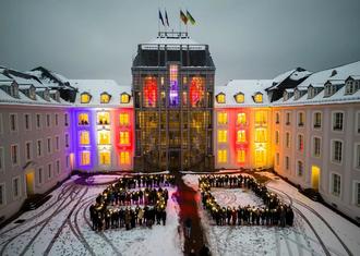 Zum Abschluss der Veranstaltung versammelten sich die Gäste auf dem Vorplatz des Schlosses, um anlässlich des Gedenktags mit einer Lichtinszenierung gemeinsam die Zahl 60 zu bilden. Die grenzüberschreitende Zusammenarbeit kann mit Zuversicht in die Zukunft blicken.