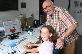 Marie lernt bei vhs-Dozent Gerhard Zägel die 10-Finger-Schreibtechnik