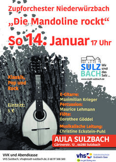Die vhs Sulzbach präsentiert im neuen Jahr „Die Mandoline rockt!“ - ein Konzert des Spiel- und Wanderclubs Niederwürzbach e.V., welches den Auftakt einer gesamten Konzertreihe des Zupforchesters im Jahr 2024 bildet.
