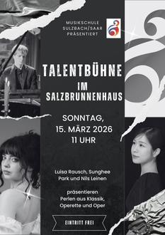 Am Sonntag, 15. März 2026, präsentieren im Salzbrunnenhaus drei junge musikalische Talente unter dem Motto „Perlen aus Klassik, Operette und Oper“ ein feuriges Potpourri pianistischer Meisterwerke und bekannter Melodien mit Werken u.a. von Johann Strauss, Franz Léhar, Paul Lincke, Felix Mendelssohn und Frédéric Chopin.