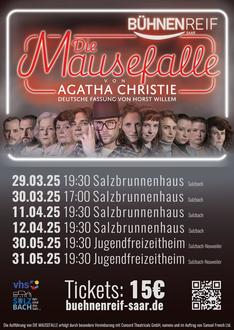 Für den Erfolg des Stückes sind skurrile Typen, Humor und natürlich – wie es sich für einen Krimi gehört – jede Menge Spannung und Nervenkitzel verantwortlich. Doch, wie lässt sich ein Stück inszenieren, das bereits so viele kennen? „Es gilt, Erwartungen zu erfüllen und gleichzeitig eigene Bilder zu erschaffen. Wir wollen auch diejenigen Zuschauer überraschen und begeistern, denen das Stück bekannt ist, ohne das Original anzutasten, um der Meisterin des Krimis gerecht zu werden. Wir bieten also eine Inszenierung, die beides vereint und sind daher überzeugt, dass es jeden mitreisen wird" erklärt Regisseur David Schreiber bei einer Probe im Neuweiler Jugendfreizeitheim. Worum geht es in der Geschichte? In London wird eine Frau ermordet. Der Täter ist flüchtig, die Polizei hat die Fahndung aufgenommen. An diesem Tag eröffnen Mollie und Giles Ralston ihre kleine Pension ”Monkswell Manor”. Sie erwarten ihre ersten Gäste, die bei starkem Schneefall nach und nach eintreffen. Die Spur des Londoner Frauenmörders führt direkt hierher. Das eingeschneite Gästehaus wird schnell zur ”Mausefalle”, in der nicht nur die Gäste, sondern auch der Mörder selbst gefangen sind. Jeder ist verdächtig, aber: wer könnte das nächste Opfer sein, wer der Mörder? Zunächst sind am 29.03., 30.03., 11.04. und 12.04 vier Vorstellungen im Salzbrunnenhaus und zwei Aufführungen am 30.05. und 31.05. im Jugendfreizeitheim in Neuweiler geplant. Die Vorstellungen im Salzbrunnenhaus sind bereits ausverkauft. Tickets für Neuweiler gibt es jedoch noch und zwar auf www.buehnenreif-saar.de sowie an der Abendkasse (solange der Vorrat reicht) für je 15€.