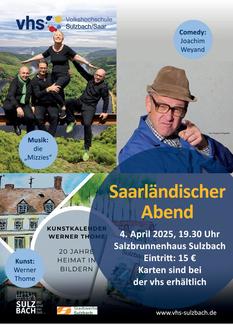 Freuen Sie sich auf einen knallbunten Abend voller Lebensfreude und Humor! „Saarländischer Abend“, Freitag, 4. April 2025, 19.30 Uhr, Salzbrunnenhaus Sulzbach. Eintritt: 15 Euro. Karten sind bei der vhs erhältlich.