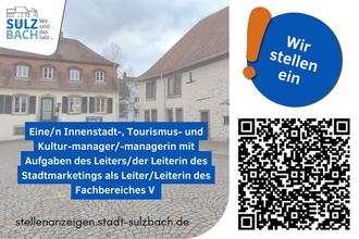 Bei Interesse bewerben Sie sich bitte bis zum 11.05.2025 vorzugsweise online über die Internetseite der Stadtverwaltung Sulzbach. (stellenanzeigen.stadt-sulzbach.de)