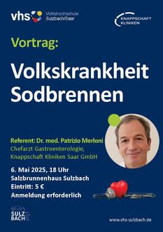 Am Dienstag, 6. Mai 2025, lädt die Volkshochschule Sulzbach zu einem informativen und allgemeinverständlichen Vortrag zum Thema „Volkskrankheit Sodbrennen“ ein. Referent ist Dr. med. Patrizio Merloni, Chefarzt der Inneren Medizin und Gastroenterologie der Knappschaft Kliniken Saar am Standort Sulzbach, der seit Jahren zu den geschätzten Partnern der vhs zählt.