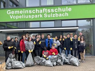 Schülerinnen und Schüler der Klassenstufen sieben und neun der Gemeinschaftsschule Vopeliuspark Sulzbach nahmen in diesem Jahr am Picobello-Tag des Entsorgungsverbands Saar teil. Unter der Leitung von Herrn Alexander Böser (im Fach Natur-Umwelt-Kultur) und Katja Quintus (im Fach Biologie) machten sich die Schüler(innen) ein Bild davon, wie sauber es an diesem Tag rund um ihre Schule ist.
