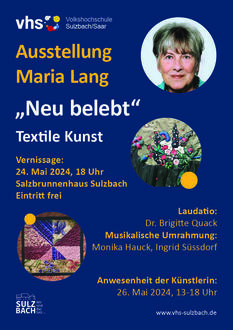 Zur Vernissage am Freitag, 24. Mai 2024, um 18 Uhr mit Laudatio und musikalischer Umrahmung laden die Künstlerin Maria Lang und die vhs Sulzbach herzlich ins Salzbrunnenhaus ein. Auch am Sonntag, 26. Mai 2024, wird die Künstlerin nach dem Kulturfrühstück des Sulzbacher Kulturvereins für interessante Gespräche anwesend sein.
