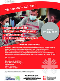 Im Rahmen des Landesprogramms „Das Saarland rückt zusammen“ bietet die Caritas Gemeinwesenarbeit Sulzbach in Kooperation mit der Katholischen Pfarrei Allerheiligen Sulzbach ab dem 17.01.2023, immer dienstags von 12:00 - 13:30 Uhr, ein kostenloses Mittagessen an. Das Essen wird durch die interkulturelle Frauengruppe der GWA zubereitet und im Gemeindezentrum der Kirche Allerheiligen, Am Kloster 6, 66280 Sulzbach, ausgegeben.