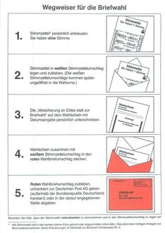 | 2. | Den Wahlschein nicht in den weißen Stimmzettelumschlag legen, sondern mit diesem in den roten Wahlbriefumschlag stecken. Sonst ist die Stimmabgabe ungültig. |