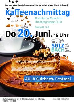 Der Seniorinnen- und Seniorenbeirat der Stadt Sulzbach lädt am Donnerstag, 20. Juni ab 15 Uhr wieder in den Festsaal der Aula zu einem kurzweiligen Kaffeenachmittag ein. Die Theatergruppe Ü 50 wird den Nachmittag mit unterhaltsamen Sketchen in Mundart umrahmen.