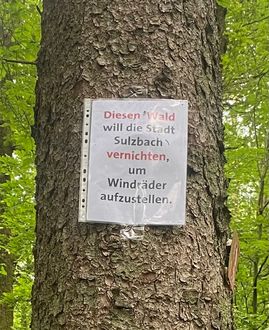 Die Verwaltung wurde in den letzten Tagen darauf aufmerksam gemacht, dass im Sulzbacher Wald Mitteilungen an einige Bäume geklebt wurden, auf denen behauptet wird, dass die Stadt Sulzbach plane, den dortigen Wald zu „vernichten“, um stattdessen Windkraftanlagen aufzustellen.