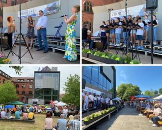 Die vielen hundert Gäste hatten es sich unter bunten Sonnenschirmen oder auf der Wiese vor der Aula bequem gemachten und lauschten ganz Ohr (oder vielleicht besser ganz "ChOhr") den Klängen, klatschten im Rhythmus oder sangen mit, wenn ihnen die Lieder bekannt waren. Hungrig oder durstig mussten sie dabei nicht bleiben, denn neben Angeboten vom Grill, Pommes Frites und Flammkuchen hatte der Sulzbacher Kunstverein Gulaschsuppe, Getränke und Kaffee im Angebot. Der Förderverein der KiTa St. Elisabeth steuerte selbstgebackene Kuchen bei.