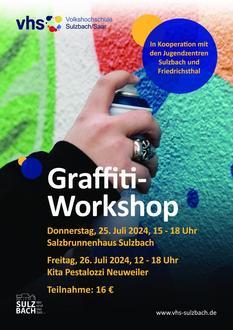In einem zweitägigen Graffiti-Workshop können sich Kinder und Jugendliche im Alter von 10 bis 16 Jahren kreativ austoben. Am ersten Tag werden Graffiti-Grundlagen erlernt, die dann am zweiten Tag nach den Ideen der Teilnehmerinnen und Teilnehmer auf eine Wand im öffentlichen Raum in Sulzbach gesprüht werden. Hierbei werden individuelle und gemeinsame Themen sichtbar gemacht.