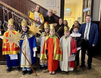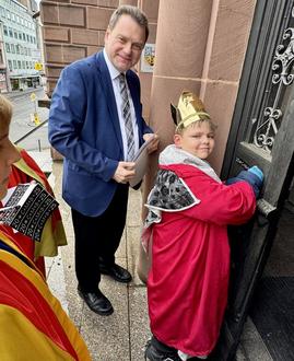 Ganz feierlich wurde es dann, als die kleinen Königinnen und Könige im Rathaus ihren traditionellen Segensspruch aufsagten und gemeinsam ein Lied sangen. „Dem Haus und jedem Menschen hier, dem wünschen und dem schenken wir, den Segen Gottes - einfach so. Wir hoffen, er macht alle froh“, hieß es dabei. Bürgermeister Michael Adam zeigte sich beeindruckt vom Engagement der Kinder und der Organisatoren. „Ich finde es ganz toll, dass ihr euch einsetzt für andere Kinder, denen es nicht so gut geht und danke euch herzlich für euren Einsatz und eure Bereitschaft, die Menschen zu besuchen und Spenden zu sammeln. Damit seid ihr ein Vorbild für uns alle. Ihr seid Gesicht und Stimme für die Kinderrechte auf der ganzen Welt. Daher sage ich auch ganz persönlich Danke für euren Einsatz und den Segen, den ihr ins Haus bringt.“