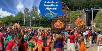 Zahlreiche Schaulustige verfolgten in der vergangenen Woche wieder die vorbeiziehende Prozession der hinduistischen Gemeinde Sulzbach, die die Gläubigen anlässlich des alljährlichen zwölftägigen Tempelfestes der Tempelgöttin Sri Maha Mariamman veranstalteten. Jedes Jahr im Sommer wird zum Höhepunkt des Festes am neunten Tag ein Straßenumzug mit der göttlichen Statue angekündigt, bei dem traditionell einmal der Tempel umrundet werden soll. Der Weg führte vom Tempel beginnend durch die Grubenstraße, Bergstraße entlang der Sulzbachtalstraße wieder zurück zum Tempel. Der Termin richtet sich immer nach bestimmten Planetenkonstellationen. Hinduistische Gläubige aus Sri Lanka reisen hierfür aus ganz Deutschland und dem benachbarten Ausland an. Für den Umzug wird die Skulptur der Tempel-Göttin, die für Fruchtbarkeit steht, reich geschmückt und mit prächtigen Stoffen bekleidet durch die Straßen gezogen und somit der Tempel einmal großzügig umrundet. Zuvor hatten Gläubige die Statue der indischen Muttergöttin nach einem hinduistischen Gottesdienst, Pooja genannt, mit Gesängen, Trommelwirbeln, Glöckchenklängen und quäkenden Fanfaren aus dem Tempel getragen und auf einem reich mit Blumengirlanden dekorierten Wagen fixiert. Als ein Zeichen der Ehrung und der Dankbarkeit legte Tempelpriester Sukithasan Sanmugasarma, den alle nur „Suki“ nennen, vor Beginn der Prozession ein Schal über die Schultern der Ehrengäste und segnete sie. Als Zeichen ihres Segens zeichnete der Priester mit dem Daumen einen Punkt mit Asche und einer Salbe auf die Stirn der ersten Beigeordneten Mary-Rose Bramer, die in Vertretung von Bürgermeister Michael Adam der Zeremonie beiwohnte. Ebenfalls geehrt wurden die Landtagsabgeordnete Anja Wagner-Scheidt und die eingesetzten Polizeikräfte. "Wir danken allen für den tollen Empfang und fühlen uns geehrt, dass wir mit ihnen gemeinsam dieses schöne Fest feiern dürfen", sagte die Beigeordnete bei ihrer Begrüßung. Die deutsche Flagge und die Flagge des Tempels wurden am Wagen der Göttin fixiert, bevor sich die Prozession langsam in Bewegung setzte. „Das sind alles Zeichen unserer Dankbarkeit für die Menschen hier und für die wunderbare Unterstützung, die wir von allen Seiten bekommen“ erklärt jemand der Tempelgemeinde. Rhythmisches Trommeln, Fanfaren, traditioneller hinduistischer Gesang, Gebete und immer wieder der durchgängige Ruf "Aroharra", was so viel bedeutet, wie im Christlichen der Ruf "Halleluja", begleiteten das Geschehen. Viele Männer trugen traditionelle Gewänder und Tücher um die Hüfte, die Frauen waren mit festlichen Saris bekleidet und trugen Blumenschmuck im Haar, die meisten Gläubigen liefen barfuß. Viele religiöse Zeremonien und rituelle Handlungen begleiteten das farbenfrohe Spektakel. Einige Frauen trugen währen der zweistündigen Prozession Töpfe mit Blumen oder Salben auf dem Kopf, andere gingen den Weg rückwärts, betend mit einer brennenden Feuerschale in den Händen, in die duftende Rauchopfer geworfen wurden, während andere sie stützten und darauf achteten, dass sie nicht stolpern. Alle Teilnehmer waren wie immer sehr offen für Fragen und erklärten gerne die Rituale. „Es gibt nicht nur hinduistische Tamilien, sondern auch christliche und muslimische. Dieses Fest hat jedoch nicht ausschließlich religiöse Hintergründe. Wir wollen damit auch unsere Kultur und Tradition aufrechterhalten und mit allen teilen.“ An den Fenstern und am Straßenrand verfolgen zahlreiche Schaulustige das farbenfrohe Spektakel, das immer wieder ins Stoppen kam. Ihnen reichten junge Zugbegleiter süße Früchte und Getränke. Das Fest und der dazugehörende Zug ist einzigartig in Südwestdeutschland. Schätzungsweise dreihundert gläubige Hindus waren gekommen. Nach fast zwei Stunden kam der Zug wieder am Tempel an. Hier wurden nun Früchte gesegnet und verteilt und Opfergaben gebracht. Der Hinduismus ist nach dem Christentum und dem Islam die drittgrößte Weltreligion und hat weltweit 900 Millionen Anhänger. Seine Anfänge reichen mehr als 4000 Jahre zurück. Im Saarland leben rund 600 Hindus. Der Tempel in Altenwald ist der größte im Südwesten Deutschlands.